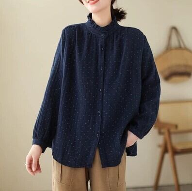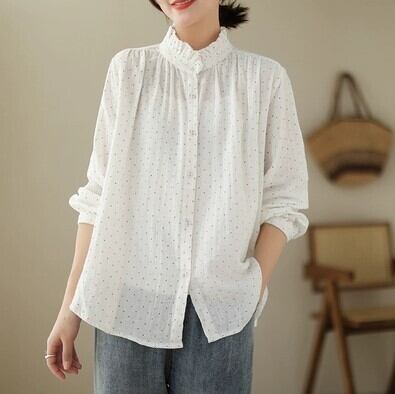 トップス ブラウス ドット柄 フリル襟 シャツ 袖あり 長袖 スタンドカラー 伸縮性 綿 薄手 コットン かわいい 可愛い きれいめ シンプル 大人 上品 おしゃれ お洒落 レトロ 大人可愛い 大人女子 こなれ感 ラブリー キュート ガーリー エレガント 抜け感 春 夏 秋 10代 20代 30代 40代 50代 60代 レディース 女性用 学生 通学 デート お出かけ 休日 着回し 普段使い 楽ちん モテ トレンド 流行 M L XL 2XL ゆったり ゆる 白 ホワイト 黒 ブラック 茶色 ブラウン