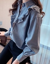 レディース トップス シャツ 長袖 ボリューム袖 襟付き 角襟 ストレート フリル パールボタン デニム ブルーデニム かわいい 大人可愛い カジュアル 上品 おしゃれ ガーリー 個性的 エレガント 存在感 ラブリー キュート アメリカン カントリー 無地 春 秋 10代 20代 30代 デート お出かけ 旅行 レストラン 女子会 休日 高原 ガーデン ショッピング コンサート ライブ お花見 カフェ 体型カバー 普段使い 着回し M L XL 2XL 3XL ゆったり 水色 ネイビー ライトブルー