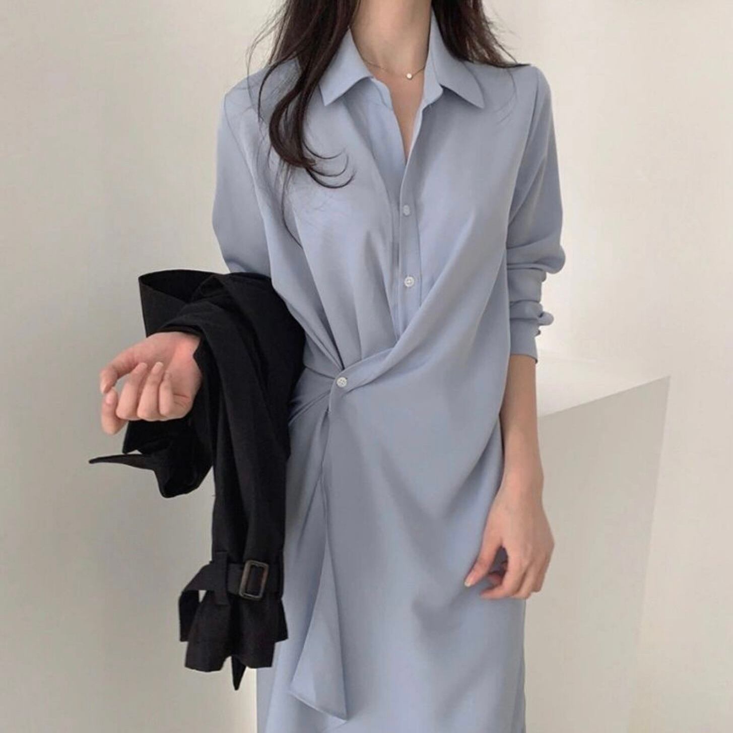 ワンピース シャツワンピース ロング丈 袖あり 長袖 襟付き ルーズ ポロカラー 前開き ポリエステル 薄手 大人可愛い きれいめ シンプル カジュアル 大人 上品 お洒落 かっこいい レトロ 大人女子 こなれ感 ラフ 個性的 クール モード系 モダン 主役級 存在感 とろみ感 抜け感 無地 春 20代 30代 40代 レディース デート お出かけ 女子会 お泊まり イベント 韓国系 オルチャン ファッション コーデ スタイル モテ 美脚 脚長 トレンド 流行 S M L XL グレーブルー ブラック