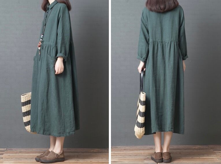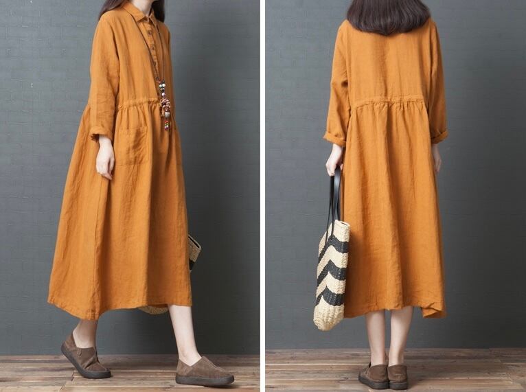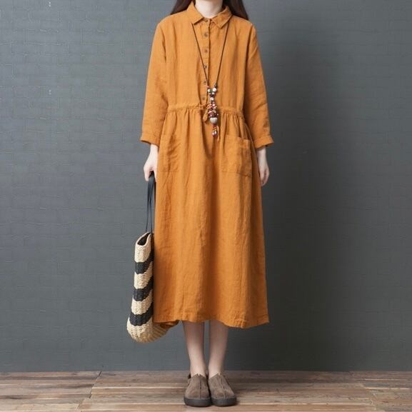 ワンピース シャツワンピース ロング丈 袖あり 長袖 襟付き ルーズ ポロカラー Aライン ハイウエスト プルオーバー 綿 麻 コットン 大人可愛い きれいめ シンプル カジュアル 大人 上品 お洒落 かっこいい レトロ 大人女子 こなれ感 ラフ クール モード系 エレガント モダン 主役級 存在感 とろみ感 抜け感 無地 秋 20代 30代 40代 レディース デート お出かけ 女子会 お泊まり 休日 普段使い 韓国系 オルチャン スタイル モテ トレンド 流行 M L XL 2XL グリーン オレンジ