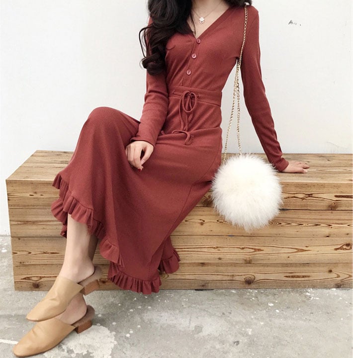 レディース ワンピース 膝下 ミモレ 長袖 Vネック フレア Aライン フリル ウエストマーク かわいい 大人可愛い シンプル カジュアル おしゃれ レトロ ガーリー 個性的 モダン 主役級 存在感 ラブリー キュート おとな フェミニン 大人女子 無地 秋 冬 ママ オフィス OL 通勤 学生 学校 通学 デート お出かけ 旅行 レストラン 女子会 休日 高原 ホテル ガーデン ショッピング 合コン コンパ カフェ 韓国 体型カバー 普段使い 着回し モテ S M L XL 2XL 黒 ブラック レッド