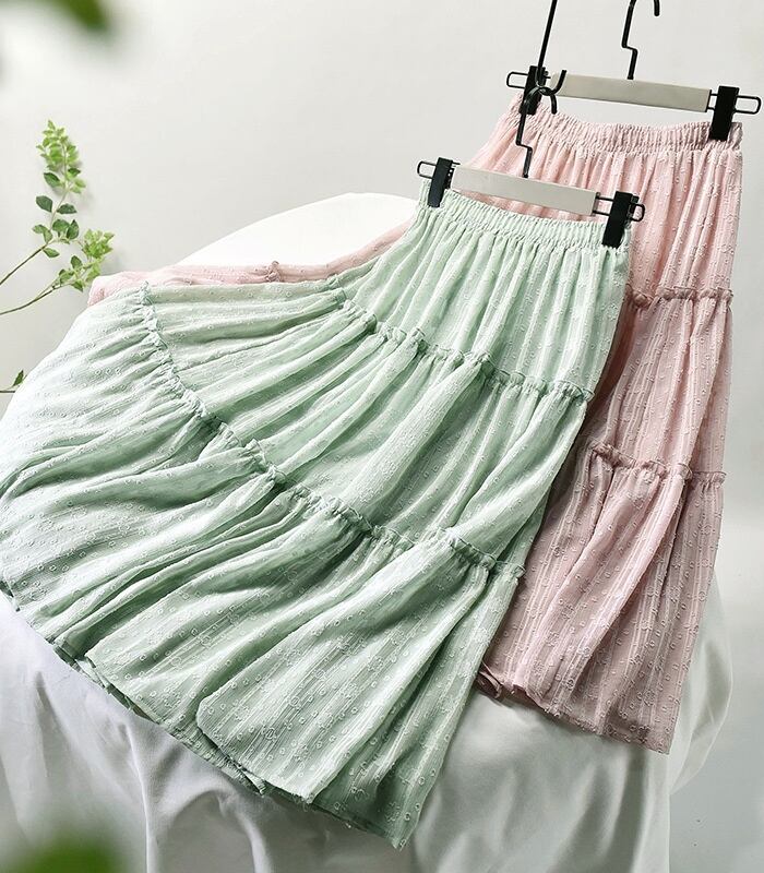 淡い色合いで春夏に1枚は持っていたいミモレ丈ティアードスカート。