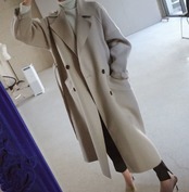 ゆったりとしたシルエットが可愛いウールロングコート。身幅にも袖にも余裕があるので中に着込んでも着膨れしにくい優秀なアイテムです。シックな色合いなので会社にも着ていきやすく、もちろんプライベートでのお出かけの際にも大活躍。ハイネックのセーターと相性抜群なのでネックレスも合わせて顔周りを華やかにしても◎