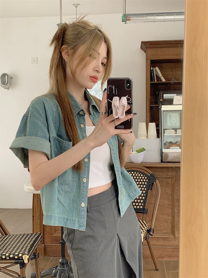 デニムシャツ トップス シャツ ショート丈 袖あり 半袖 襟付き 角襟 ポケット 前開き デニム かわいい シンプル カジュアル 大人 おしゃれ お洒落 かっこいい こなれ感 メンズライク ボーイッシュ ルーズ 個性的 クール 抜け感 無地 春 夏 10代 20代 レディース 女性用 学生 通学 お出かけ ショッピング 着回し 普段使い 双子 韓国系 オルチャン ファッション コーデ スタイル 楽ちん モテ 体系カバー トレンド 流行 インスタ映え サイズ S M L ゆったり ライトブルー