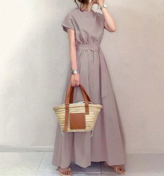 ワンピース マキシ丈ワンピース フレアワンピース 袖あり 半袖 襟なし ラウンドネック ウエストベルト かわいい 大人可愛い シンプル カジュアル 大人 上品 おしゃれ お洒落 かっこいい レトロ 大人女子 こなれ感 ラフ キュート ガーリー 個性的 主役級 存在感 春 夏 10代 20代 30代 レディース 女性用 OL 通勤 ママ マタニティ 学生 通学 デート お出かけ 公園デビュー 女子会 お泊まり 休日 着回し 普段使い ワンサイズ ゆったり ゆる 体型カバー ファッション コーデ