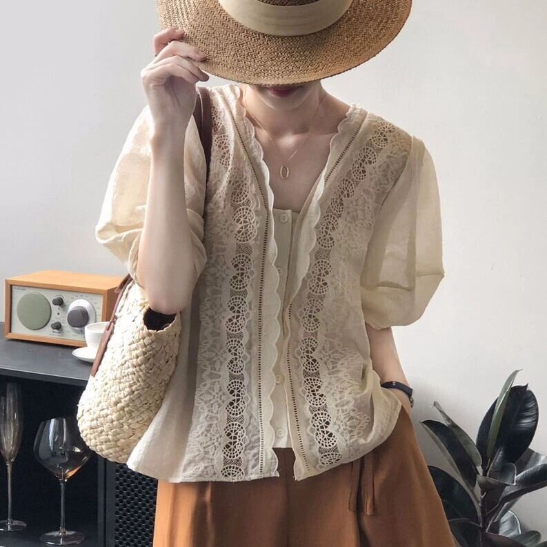 トップス ブラウス レース パフスリーブ 透け感 清楚 袖あり 半袖 5分袖 五分袖 Vネック 襟なし 前開き 薄手 かわいい 可愛い きれいめ カジュアル 大人 上品 おしゃれ お洒落 大人可愛い 大人女子 こなれ感 ラフ ラブリー キュート ガーリー 抜け感 無地 春 夏 秋 10代 20代 30代 40代 50代 60代 レディース 女性用 学生 通学 デート お出かけ 休日 着回し 普段使い モテ トレンド 流行 インスタ映え ゆったり ゆる ワンサイズ 白 ホワイト 自然体 やわらか ふんわり