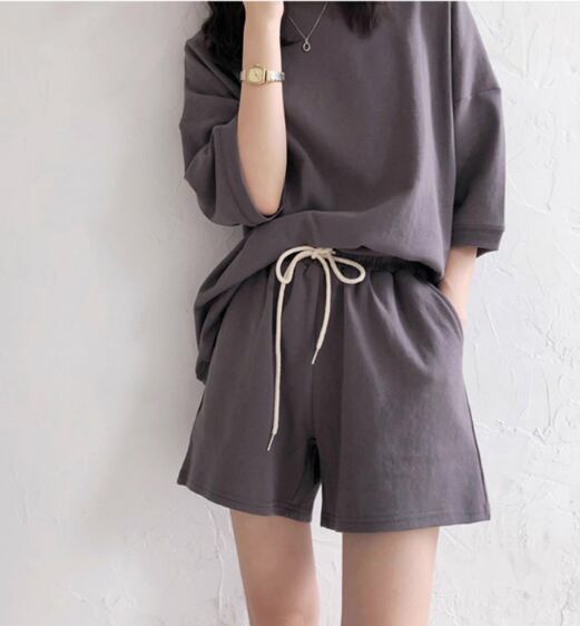ショートパンツとスウェットトップスのセットアップ。ショートパンツはカジュアルなデザインで、5分袖のスウェットトップスとの相性が抜群です。ルーズでラフなシルエットがこなれ感を演出し、抜け感のあるスタイルに仕上げます。