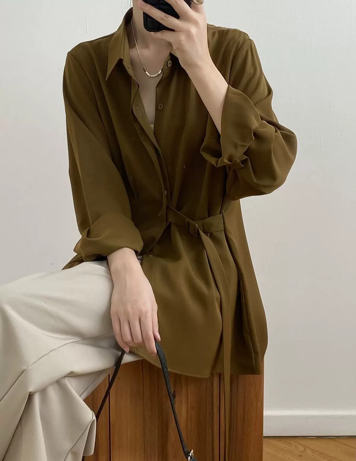 トップス シャツ ルーズフィット ウエストマーク ベルト 袖あり 長袖 襟付き ストレート 薄手 かわいい 可愛い きれいめ シンプル 大人 上品 おしゃれ お洒落 かっこいい 大人可愛い 大人女子 こなれ感 ラフ 個性的 クール モード系 エレガント 主役級 存在感 抜け感 無地 春 秋 10代 20代 30代 40代 50代 60代 レディース 女性用 オフィス ビジネス OL 通勤 学生 通学 デート お出かけ 休日 着回し 普段使い スタイルアップ 楽ちん 体系カバー M L ゆったり ゆる