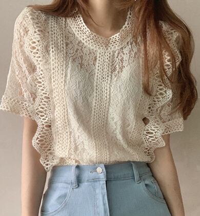 透かし編みデザインが涼しげで可愛い半袖トップス。透けてしまうのでインナーは必要ですが、レースの模様がとても上品でエレガントな一枚です。存在感のあるトップスなのでシンプルなボトムスと相性抜群。いつものジーンズもこのアイテムと合わせればおしゃれに変身します。