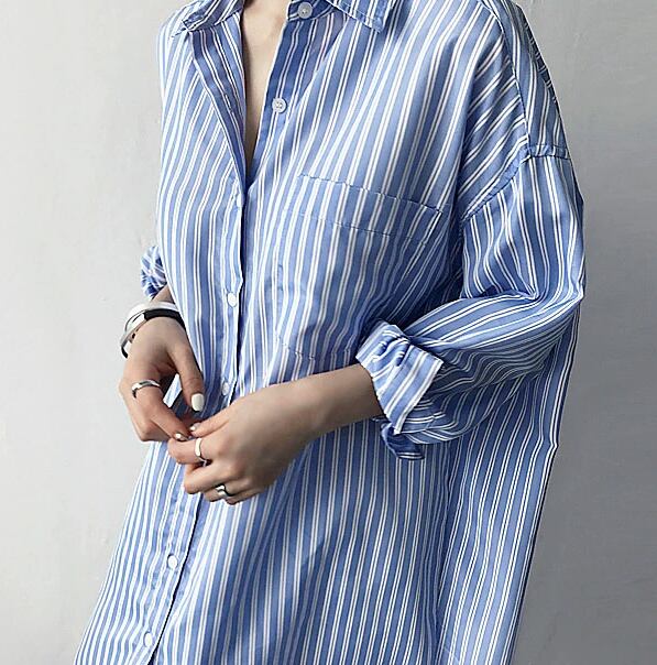 トップス シャツ 袖付き 長袖 ロング丈 襟付き 角襟 前開き ボタン 薄手 サイドスリット かわいい 大人可愛い シンプル カジュアル 大人 上品 おしゃれ お洒落 かっこいい レトロ 大人女子 こなれ感 ラフ メンズライク ボーイッシュ スポーティ 個性的 主役級 存在感 春 夏 秋 ストライプ柄 レディース 女性用 OL 通勤 ママ マタニティ 学生 通学 デート お出かけ 公園デビュー 女子会 お泊まり 休日 旅行 リゾート ホテル レストラン ショッピング 着回し 普段使い 重ね着 日焼け防止