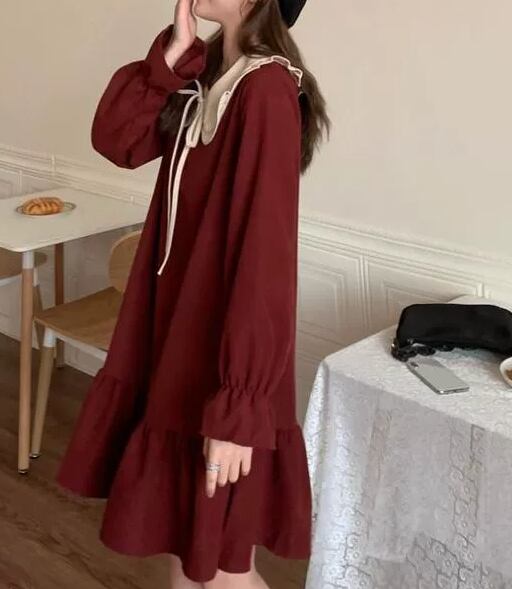 レディース スカート トップス ワンピース フレア 膝上 長袖 萌袖 キャンディスリーブ ラウンドネック 襟付き Aライン フリル リボン かわいい シンプル おしゃれ レトロ ガーリー ラブリー キュート クラシカル カレッジ風 ベーシック ナチュラル 無地 春 秋 冬 誕生日 ロングシーズン 学生 学校 通学 デート お出かけ お泊まり イベント 旅行 女子会 休日 ショッピング コンサート ライブ カフェ モテ インスタ映え フリーサイズ クリーム レッド アプリコット 赤 ボルドー バーガンディ