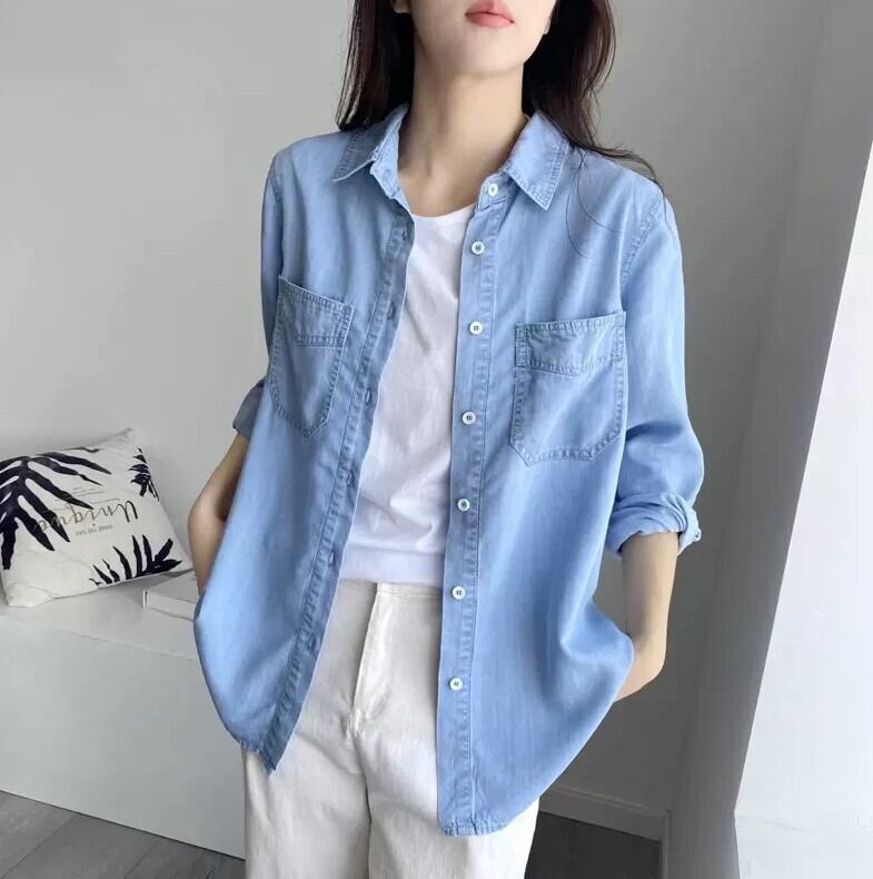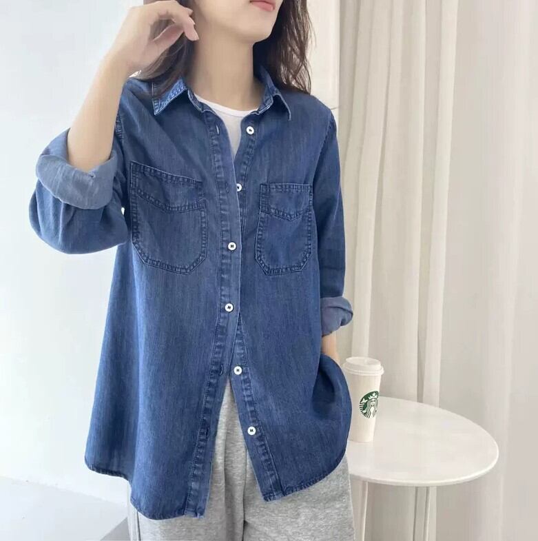 トップス シャツ 羽織 デニムシャツ ざっくり 袖あり 長袖 襟付き ストレート 前開き デニム 薄手 かわいい 可愛い きれいめ シンプル カジュアル 大人 上品 おしゃれ お洒落 かっこいい レトロ 大人可愛い 大人女子 こなれ感 ラフ メンズライク クール 抜け感 無地 春 秋 10代 20代 30代 40代 50代 60代 レディース 女性用 学生 通学 デート お出かけ 休日 着回し 普段使い 楽ちん 定番 S M L XL ゆったり ゆる ブルーデニム トレンド 流行 青 ブルー 水色