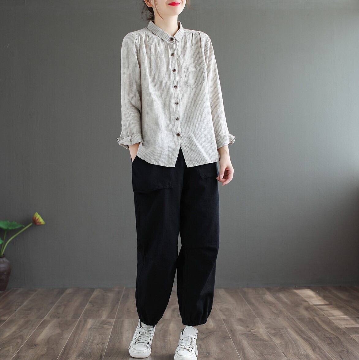 トップス シャツ ストライプ 袖あり 長袖 襟付き 前開き 綿 麻 リネン 薄手 コットン かわいい 可愛い シンプル カジュアル 大人 上品 おしゃれ お洒落 かっこいい アジアン 大人可愛い 大人女子 こなれ感 ラフ メンズライク クール 抜け感 春 秋 10代 20代 30代 40代 50代 60代 レディース 女性用 学生 通学 デート お出かけ 休日 着回し 普段使い 楽ちん M L XL 2XL ゆる ルーズフィット ざっくり 自然体 羽織 やわらか ブルー オフホワイト ベージュ ネイビー