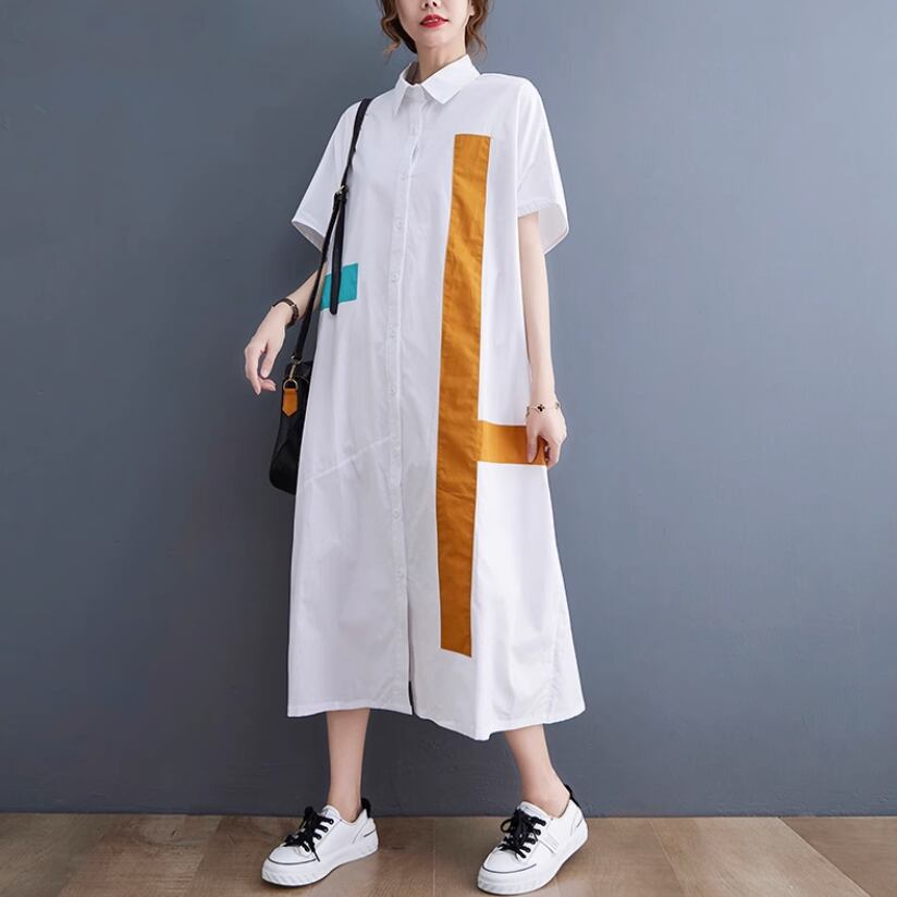 レディース ワンピース シャツワンピ ロングスカート ロング 半袖 襟付き ストレート Aライン ポケット 前開き かわいい 大人可愛い きれいめ カジュアル おしゃれ かっこいい レトロ ラフ メンズライク ガーリー 個性的 クール 柄 夏 デート お出かけ 休日 コーデ 楽ちん 体型カバー L XL ゆったり ゆる 白 ホワイト 黒 ブラック