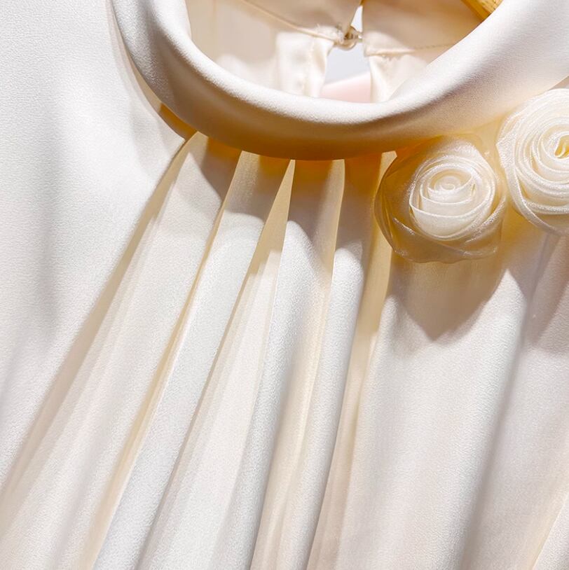 爽やかな清楚さと上品な女性らしさを演出する、ミドル丈のシャツです。カフスリーブとスタンドカラーがシンプルでありながらも華やかさを加え、大人可愛い雰囲気を醸し出しています。細プリーツのシフォン素材が女性らしい動きを生み出し、コサージュがさりげないアクセントになっています。入学式や卒業式からデートやパーティーなどの特別なイベントまで、幅広いシーンで活躍すること間違いありません。