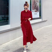 ワンピース シャツワンピース ロング丈 袖あり 長袖 襟付き スタンドカラー ルーズ Aライン ベルト ウエストマーク ポケット ハイウエスト 前開き 大人可愛い きれいめ シンプル カジュアル 大人 上品 お洒落 かっこいい レトロ 大人女子 こなれ感 ラフ クール エレガント 主役級 存在感 とろみ感 抜け感 無地 秋 20代 30代 40代 レディース デート お出かけ 女子会 お泊まり 休日 レストラン ショッピング 普段使い 韓国系 オルチャン モテ トレンド 流行 S M L XL レッド
