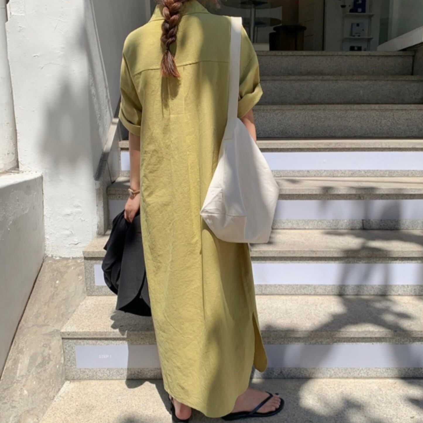 ワンピース シャツワンピース ロング丈 袖あり 半袖 襟付き ルーズ ストレート ポケット 前開き 薄手 大人可愛い きれいめ シンプル カジュアル 大人 上品 お洒落 かっこいい レトロ 大人女子 こなれ感 ラフ クール モード系 モダン 主役級 存在感 とろみ感 抜け感 無地 夏 20代 30代 40代 レディース デート お出かけ 女子会 お泊まり 休日 アウトドア 旅行 ショッピング 普段使い 韓国系 オルチャン 楽ちん 体系カバー トレンド 流行 S M L XL グリーン グレー アプリコット