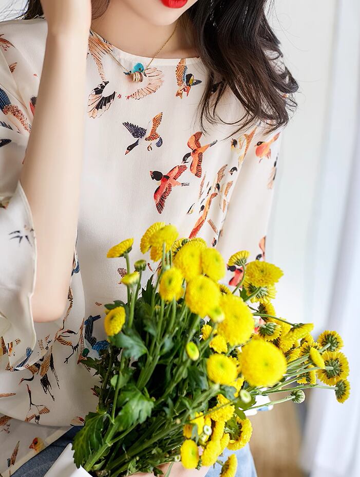 かわいさと上品さが共存する、レディーストップスの登場です。ベルスリーブとワイドシルエットが、女性らしい印象を引き立ててくれます。さらに、かわいいバードプリントが、おしゃれなアクセントになっています。カラフルな鳥たちが描かれたデザインは、夏のデートやお出かけにぴったりです。
