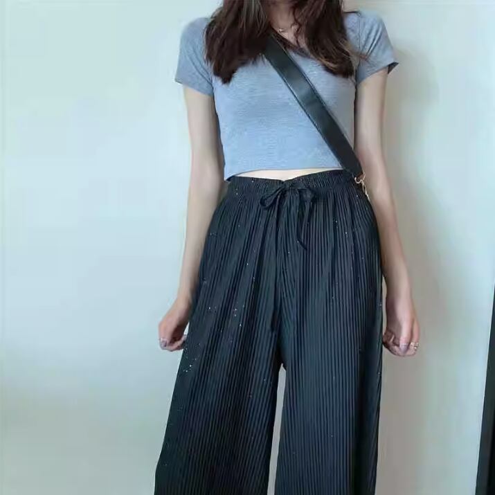 ボトムス パンツ ワイドパンツ カジュアルパンツ 9分丈 ワイド プリーツ ハイウエスト ウエストゴム スパンコール かわいい 大人可愛い きれいめ カジュアル 大人 上品 おしゃれ お洒落 大人可愛い 大人女子 こなれ感 個性的 エレガント とろみ感 無地 春 夏 秋 10代 20代 30代 40代 50代 60代 レディース 通勤 通学 休日 ショッピング 着回し 普段使い 韓国系 オルチャン 楽ちん モテ 体系カバー 美脚 脚長 トレンド XL 2XL 大きいサイズ 黒 ブラック アプリコット