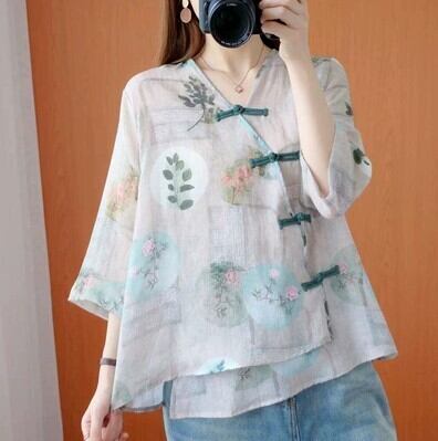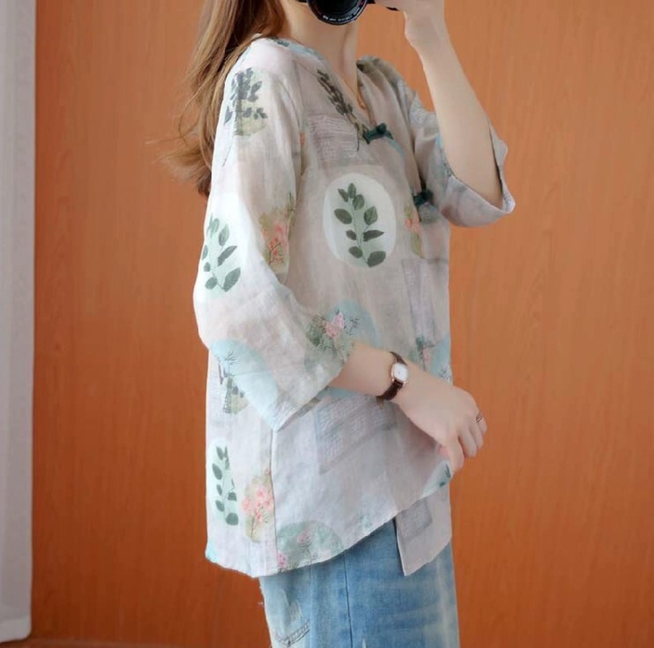 トップス ブラウス チャイナ 中華風 袖あり 5分袖 五分袖 襟なし 綿 薄手 コットン かわいい 可愛い きれいめ カジュアル 大人 上品 おしゃれ お洒落 かっこいい アジアン 大人可愛い 大人女子 こなれ感 ラフ 個性的 抜け感 花柄 フラワー 春 夏 秋 10代 20代 30代 40代 50代 60代 レディース 女性用 学生 通学 デート お出かけ 休日 イベント 普段使い 楽ちん L XL ゆったり ゆる 紫 パープル 灰色 グレー Vネック 透け感 ラブリー キュート 華やか やわらか