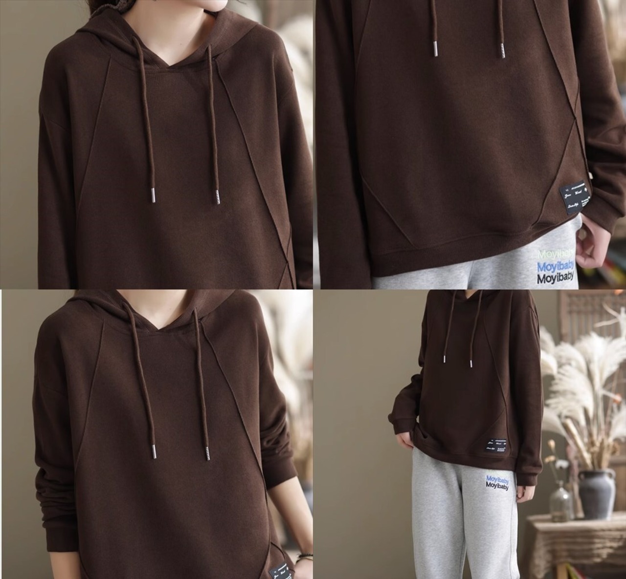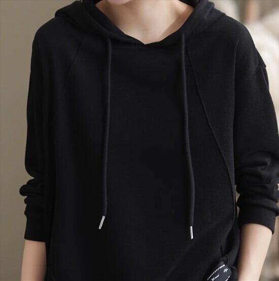 さらに、このトップスの特徴はその着心地の良さです。フード付きでカジュアルさも兼ね備えており、長袖で春秋にぴったり。その素材は柔らかで、身体に優しくフィットします。女性らしいシルエットで体型カバーもばっちり。