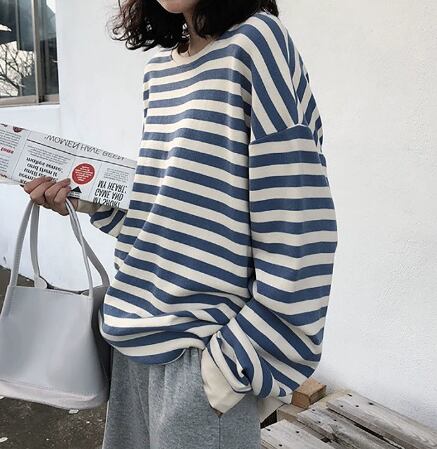 だぼっとしたシルエットが可愛いオーバーサイズTシャツ。ドロップショルダーなのもアクセントになっていてキュートです。シックでシンプルなボーダー柄なのでカジュアルコーデが好きな方におすすめ。存在感のあるトップスなので無地のボトムスを合わせるとコーディネートが纏まります。爽やかなブルー系もよく合います。