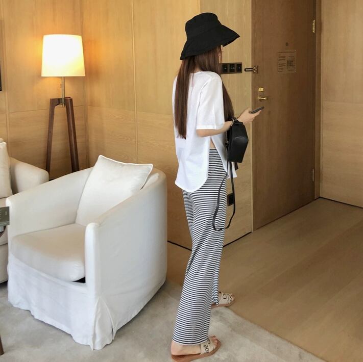 半袖のトップスとワイドストレートなパンツの組み合わせは、
