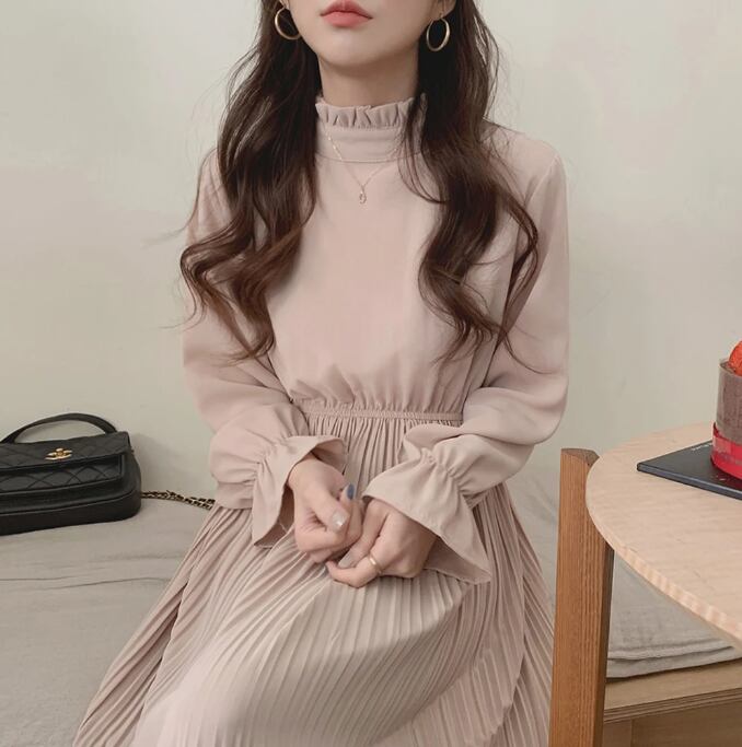 レディース ワンピース ロング 長袖 フレアスリーブ ハイネック フレア プリーツ かわいい 大人可愛い きれいめ シンプル カジュアル 上品 おしゃれ かっこいい レトロ こなれ感 ラフ メンズライク ルーズ 個性的 クール モード系 エレガント モダン 主役級 存在感 とろみ感 抜け感 ラブリー キュート 都会的 ナチュラル 無地 春 秋 冬 デート お出かけ パーティー 旅行 女子会 休日 ガーデン ショッピング 合コン コンパ カフェ 婚活 韓国 オルチャン コーデ 楽ちん プチプラ 普段