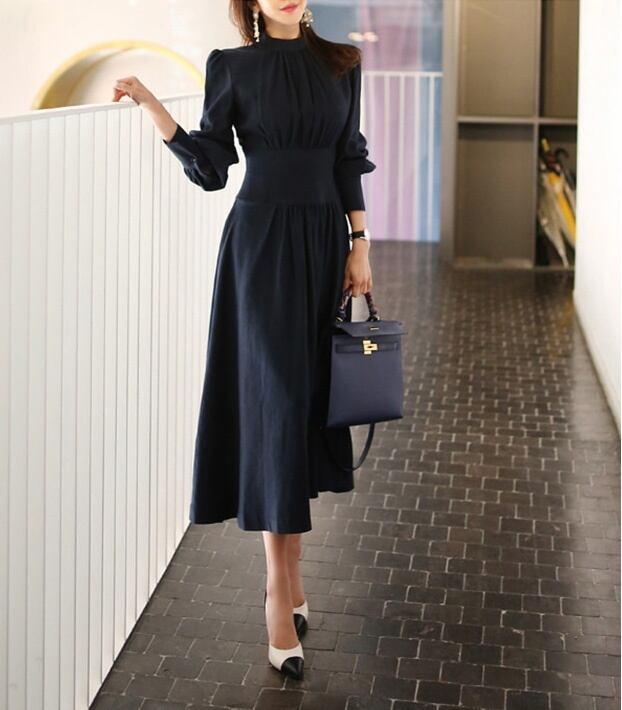 ドレス パーティードレス フォーマルドレス ワンピドレス 膝丈 7分袖 パフスリーブ ノーカラー ギャザー 中厚手 大人可愛い きれいめ シンプル カジュアル 上品 こなれ感 ラフ ガーリー エレガント 主役級 フォーマル 無地 春 夏 秋 卒業式 授業参観 ママ お出かけ パーティー 女子会 休日 ホテル 発表会 脚長 清楚 流行 インスタ映え S M L XL ネイビーブルー