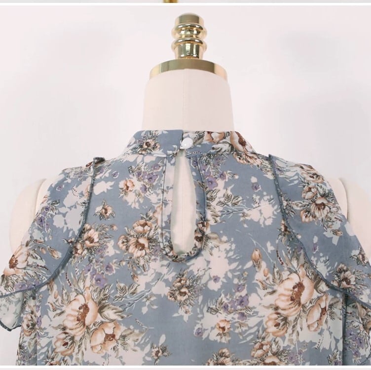 可憐な花柄とフリル袖が魅力のシフォンブラウス。