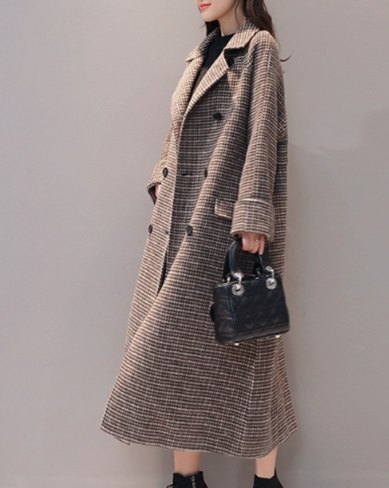 シックなカラーと異国風のスタイリッシュなデザインが大人可愛いロング丈のウールコート。存在感のある千鳥格子柄も可愛いです。背中部分に切り替えが入っているので後ろ姿もおしゃれ。しっかりとした厚みのあるアイテムなので寒い季節に重宝します。