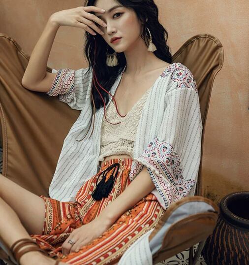 異国情緒漂うエスニック風のロングカーディガン。柔らかなシフォン素材なので動く度に軽やかに裾が揺れてとても美しいです。七分袖なので夏の暑い時期の日焼け対策、冷房対策のアイテムとしても重宝します。