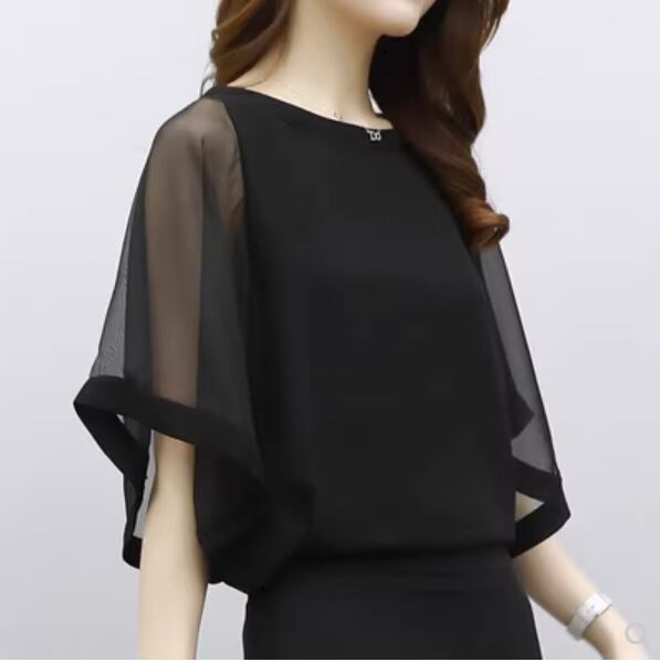 おしゃれで個性的なレディーストップス。7分袖のドロップショルダーデザインとオープンショルダーのデザインが、女性らしさを引き立てます。背中開きやタックプリーツ、シフォン素材などの要素がエレガントさを演出しています。