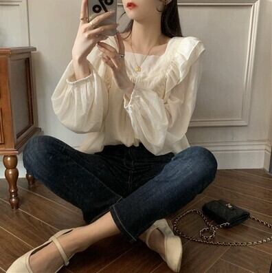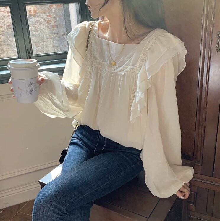 トップス ブラウス フリル ボリューム袖 袖あり 長袖 スクエアネック 襟なし シフォン 薄手 かわいい 可愛い きれいめ 大人 上品 おしゃれ お洒落 大人可愛い 大人女子 こなれ感 ラフ ラブリー キュート ガーリー エレガント 抜け感 無地 春 夏 秋 10代 20代 30代 40代 50代 60代 レディース 女性用 学生 通学 デート お出かけ 休日 普段使い モテ トレンド 流行 S M L ゆったり ゆる 白 ホワイト オーバーサイズ シフォンブラウス ふんわり やわらか ひらひら