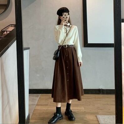 2点セット 上下セット ブラウス スカート リボンタイ 秋カラー ロング ロング丈 袖あり 長袖 前開き かわいい 可愛い きれいめ シンプル 大人 上品 おしゃれ お洒落 レトロ 大人可愛い 大人女子 こなれ感 ラブリー キュート ガーリー 抜け感 無地 秋 冬 10代 20代 30代 40代 50代 60代 レディース 女性用 学生 通学 デート お出かけ 休日 着回し 普段使い 楽ちん トレンド 流行 S M L XL 茶色 ブラウン ベーシック Aライン お嬢様 お得 ボタン ドレープ シック