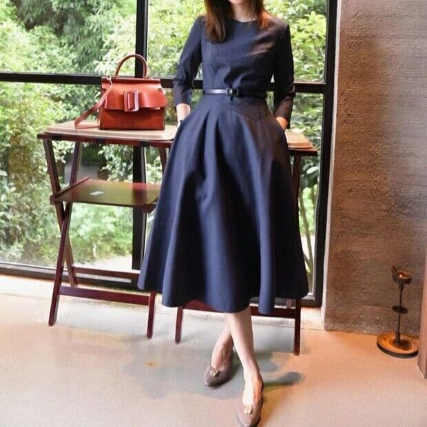 レディース ワンピース ロング丈 7分袖 ラウンドネック Aライン ファスナー 大人可愛い きれいめ 上品 おしゃれ お洒落 かっこいい 大人女子 ラフ ガーリー クール エレガント フォーマル 無地 春 秋 通勤 デート お出かけ 女子会 お泊まり 休日 パーティー イベント 旅行 ホテル レストラン ショッピング 普段使い お揃い 韓国 ファッション コーデ 楽ちん モテ 美脚 脚長 プレゼント ギフト インスタ映え S M L XL 大きいサイズ ネイビー ライトグレー