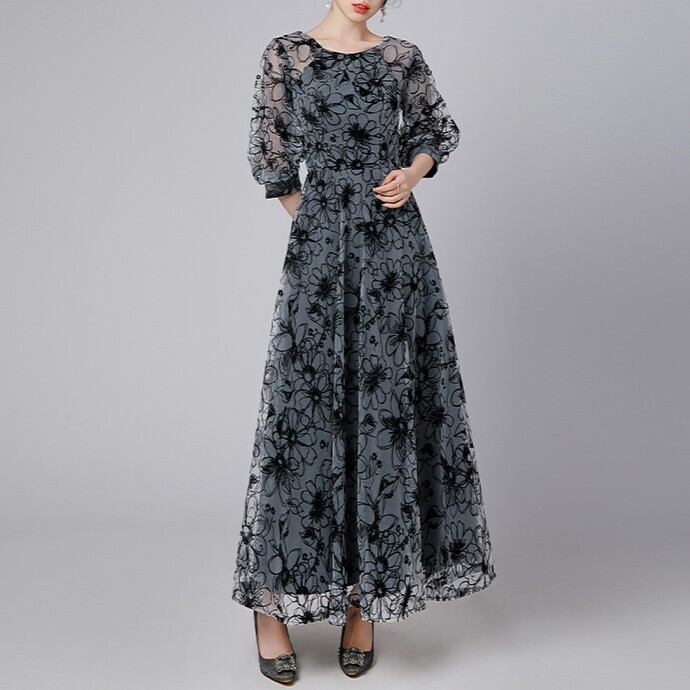 シンプルでありながらも華やかさを兼ね備えたレディースのロング丈ドレスのご紹介です。7分袖のパフスリーブとUネックデザインが特徴で、女性らしさを引き立てながらもエレガントさを演出します。美しいレース素材と花柄プリントは、特別な日や演奏会、披露宴など、さまざまなシーンで魅力を発揮します。主役級の存在感を誇るこのドレスは、大人女子にぴったりのアイテムです。